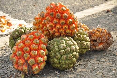 Hình ảnh quả của cây dứa dại – Quả hình trứng, màu vàng cam, có cuống, bề mặt quả sần sùi