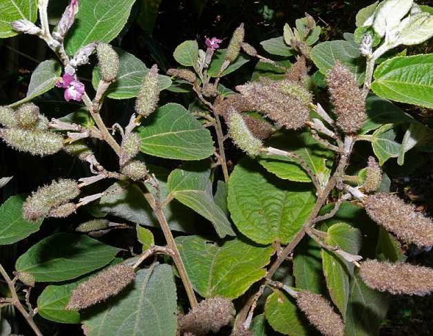 Đây là dạng cây bụi cao 1-3m, nhánh hình trụ, có lông. Lá hình trái xoan, dài 5-17cm, rộng 2,5-7,5cm. Gốc cụt hay hình tim, đầu thon thành mủi nhọn. Mép có răng không đều.